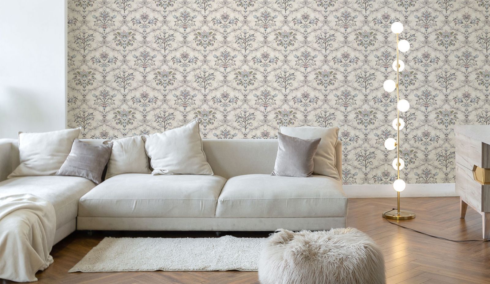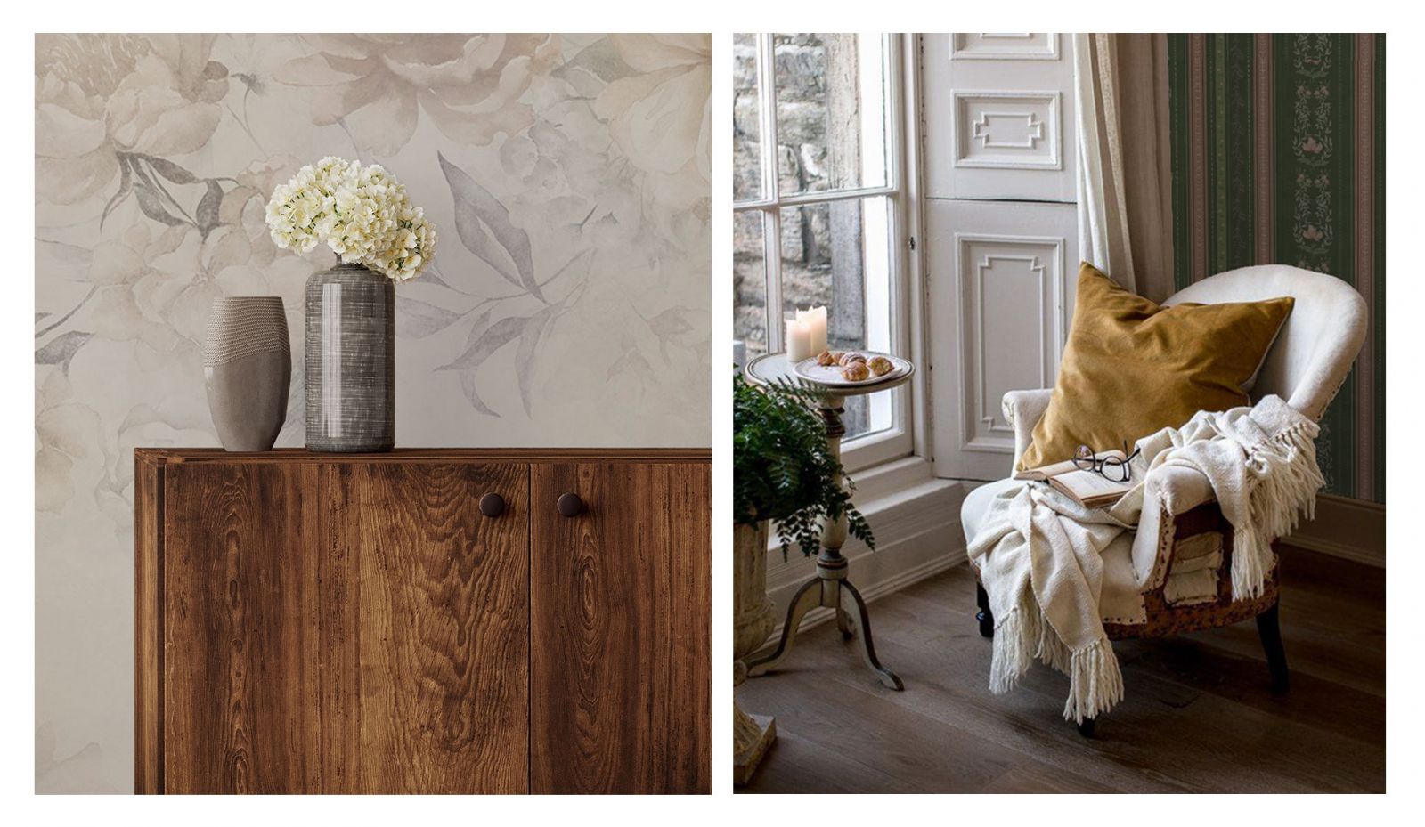 Как правило, стены в переходном стиле являются лёгким ненавязчивым фоном. Из материалов предпочтение отдаётся фактурной штукатурке, декоративному кирпичу с эффектом натуральной кладки, деревянным панелям. Чтобы привнести ту самую индивидуальность и изюминку в переходный интерьер, отличным выбором станут обои с лёгким ненавязчивым сюжетом. Гармоничные цветовые вариации, дизайнерские сюжеты на любую тематику (будь то классические узоры и вензеля или та же имитация природных текстур) позволят создать оригинальный акцент на определённой зоне вашего пространства, наполнят его смыслом и оригинальностью. К тому же, они максимально экологичны, подходят для размещения в спальнях и детских комнатах.